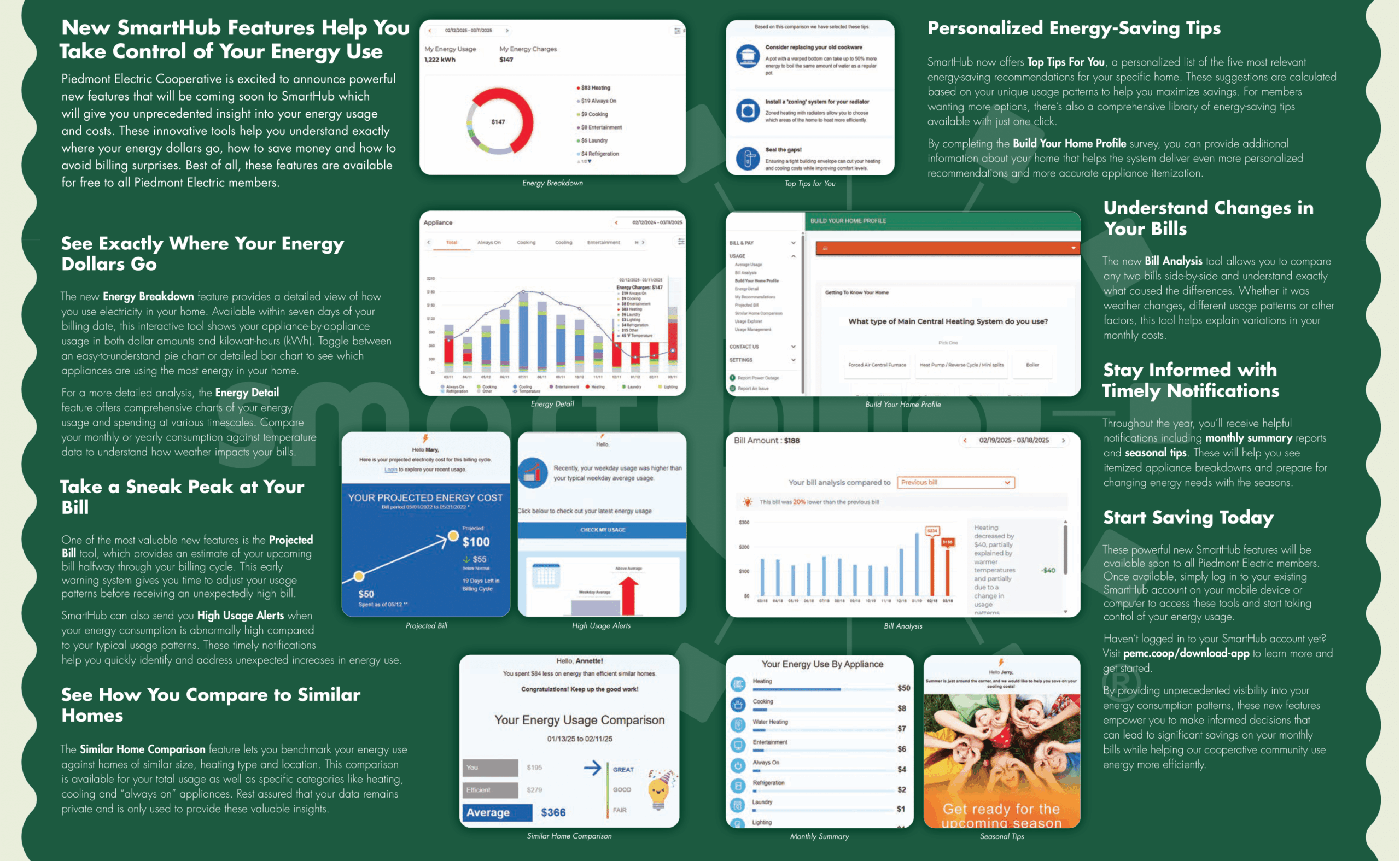Piedmont Electric Cooperative is excited to announce powerful new features that will be coming soon to SmartHub which will give you unprecedented insight into your energy usage and costs. These innovative tools help you understand exactly where your energy dollars go, how to save money and how to avoid billing surprises. Best of all, these features are available for free to all Piedmont Electric members.